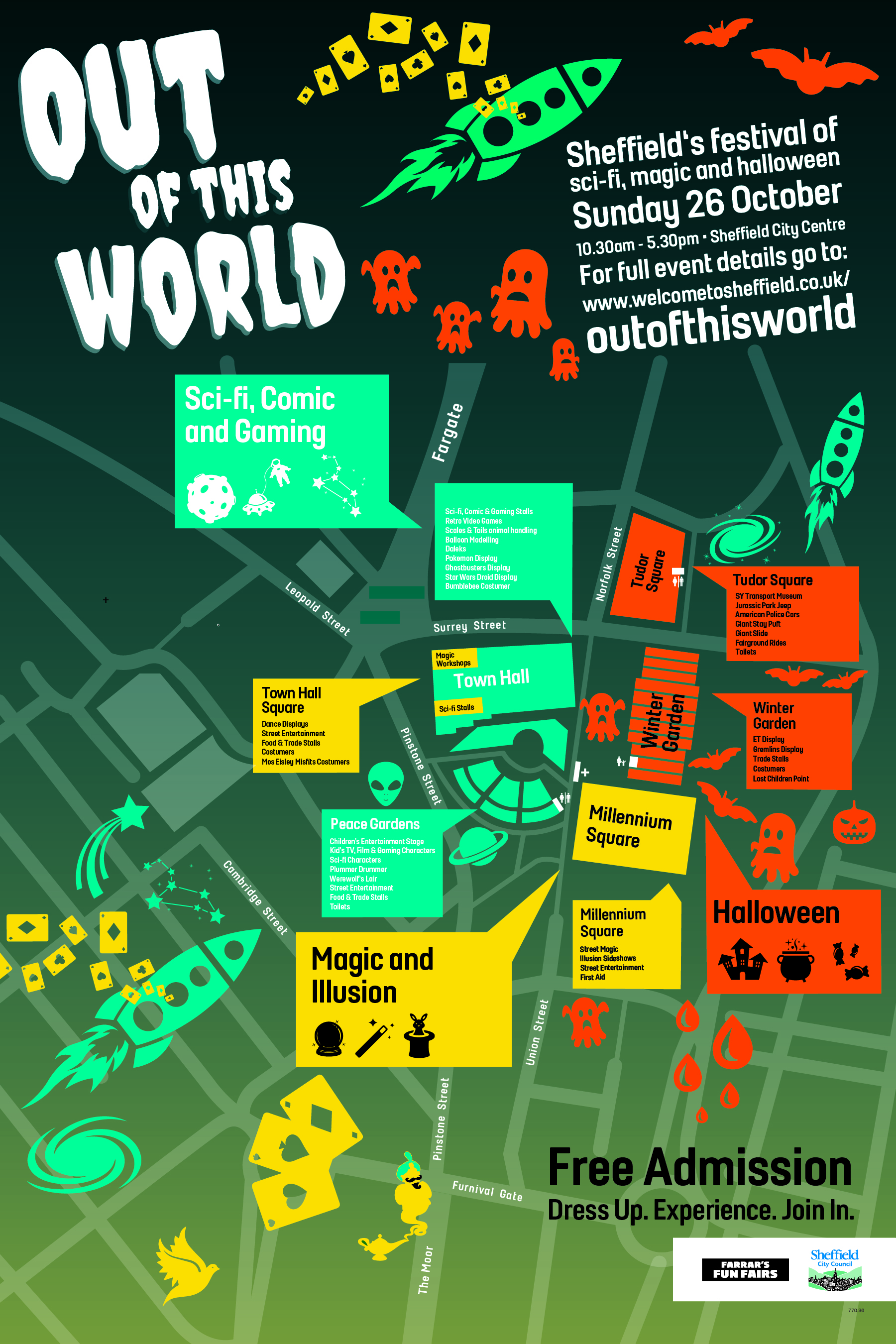 The Winter Garden, Tudor Square and Peace Gardens play host to the ever popular sci-fi, comic book, gaming and fantasy areas, while the Halloween Zone can be found spread across Town Hall Square, the Peace Gardens, Pinstone and Surrey Street.